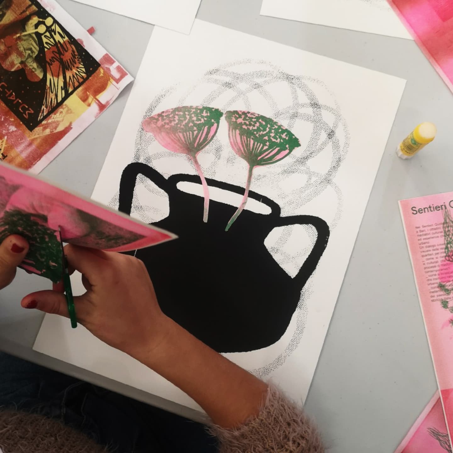 Una volta creato ognuno il proprio colore, si è pronti a stampare su carta e tessuto una composizione collettiva: sull’illustrazione di Michele Santella, ogni partecipante integrerà il proprio contributo utilizzando il proprio stencil personalizzato, in un gioco di sovrapposizioni e sistemi modulari.